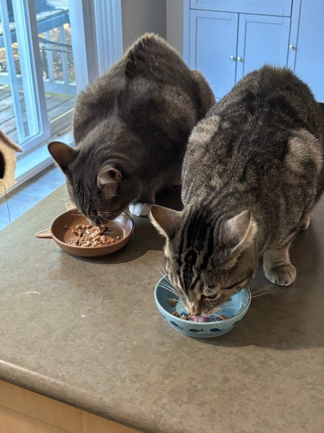 Pip must be going through a growth spurt because he has a hollow leg for the last few weeks. He sits in the spot where we normally give him wet food once per day, and meows plaintively until either Jason or myself (usually me!) takes pity on him and feeds him. But then along comes Ted, looking for extra food, so we try to be as stealthy as possible when offering extra food to the hungry baby.