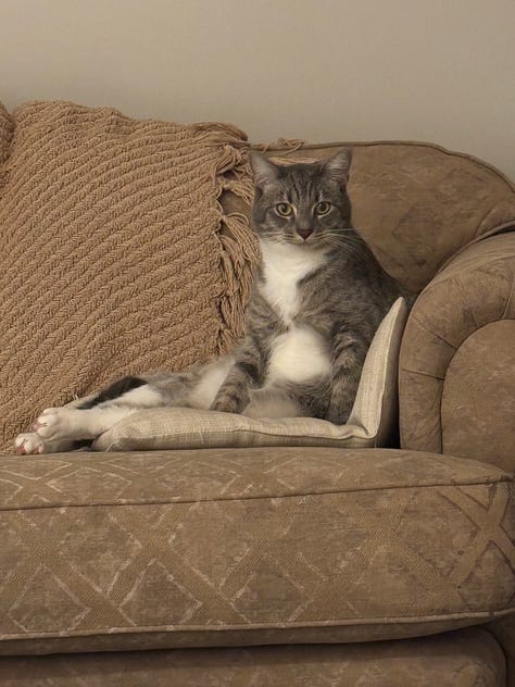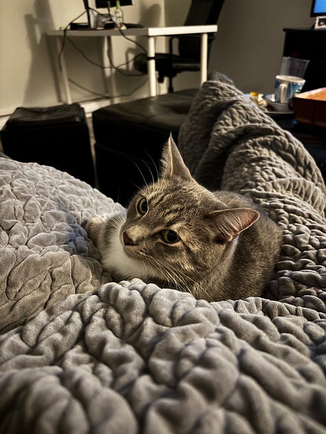 I’m loving the weather turning colder because Pippin is even cuddlier. All night, while we sleep, he gets as close as he can, and every once in a while he’ll settle on my blanketed lap while I’m reading or watching TV or writing (which means a lot of juggling with my laptop!). He still purrs loudly whenever we come near to pet him, even if we wake him from a sound sleep.