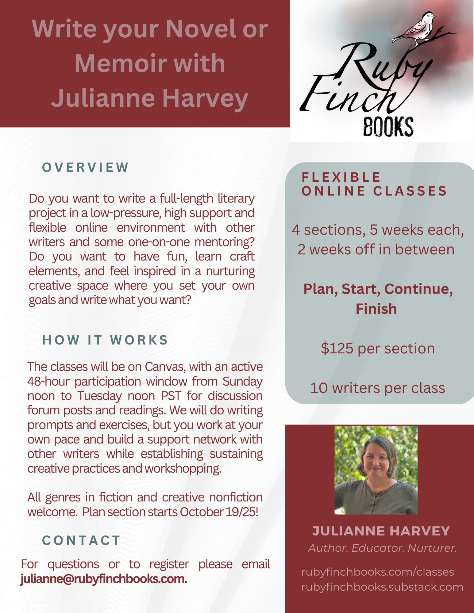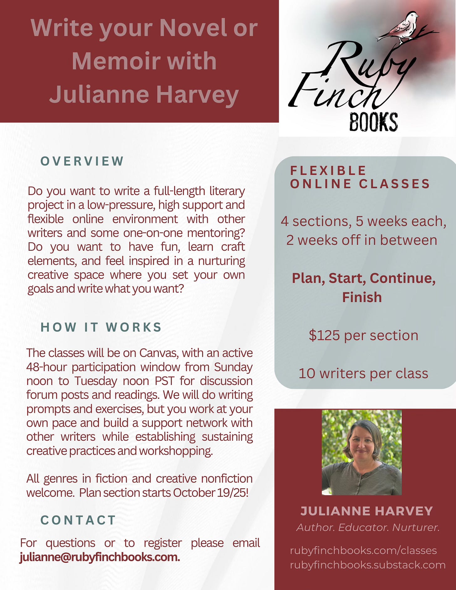 My next iteration of my 20-week online writing class is just around the corner now, beginning October 19, 2025. I have an eager writer signed up and ready to rock and roll, and I’m crossing every finger and toe that a few more writers reach out quickly to join in on the fun. This class was such an inspiring and productive experience in 2024-2025 that I hope it grows and continues to develop this year into 2026.