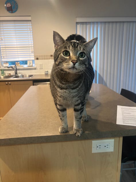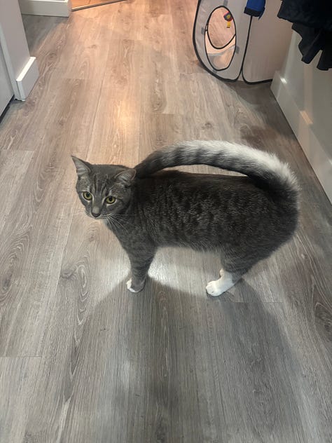 Our cat sitter this summer took the picture of Pip on the right, where he showcases proudly what we call his monkey tail. In all of my years of having cats, I’ve never seen one with a tail like Pippin’s. When he was tiny, his tail was so thin and small that we called it a rat tail.