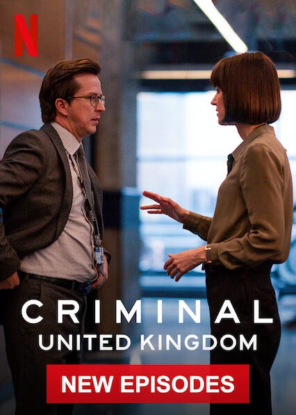 I wanted to try Criminal UK on Netflix because it was Sharon Horgan’s face on the poster I saw, and I love her. So we gave it a whirl and fell in love with this intense locked room series, with a different criminal in each episode. The writing and acting are razor sharp. The UK version was my favourite, but we watched them all (France, Germany, Spain).